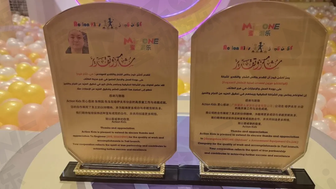 在驗(yàn)收當(dāng)天,場館的負(fù)責(zé)人對整個工程的質(zhì)量和安全表示滿意。我們的施工代表佘工和沙特場館負(fù)責(zé)人一起合影留念,記錄下這個重要時刻。合影中,佘工不僅展示了個人獎牌,更有蜜動游樂公司的榮譽(yù)獎牌,這既是對個人努力的肯定,也是對整個團(tuán)隊(duì)配合默契的最好證明?,F(xiàn)場所有人都能感受到這份踏實(shí)與實(shí)在,大家都對未來充滿信心。