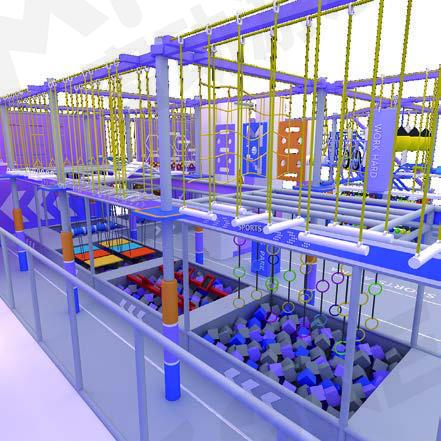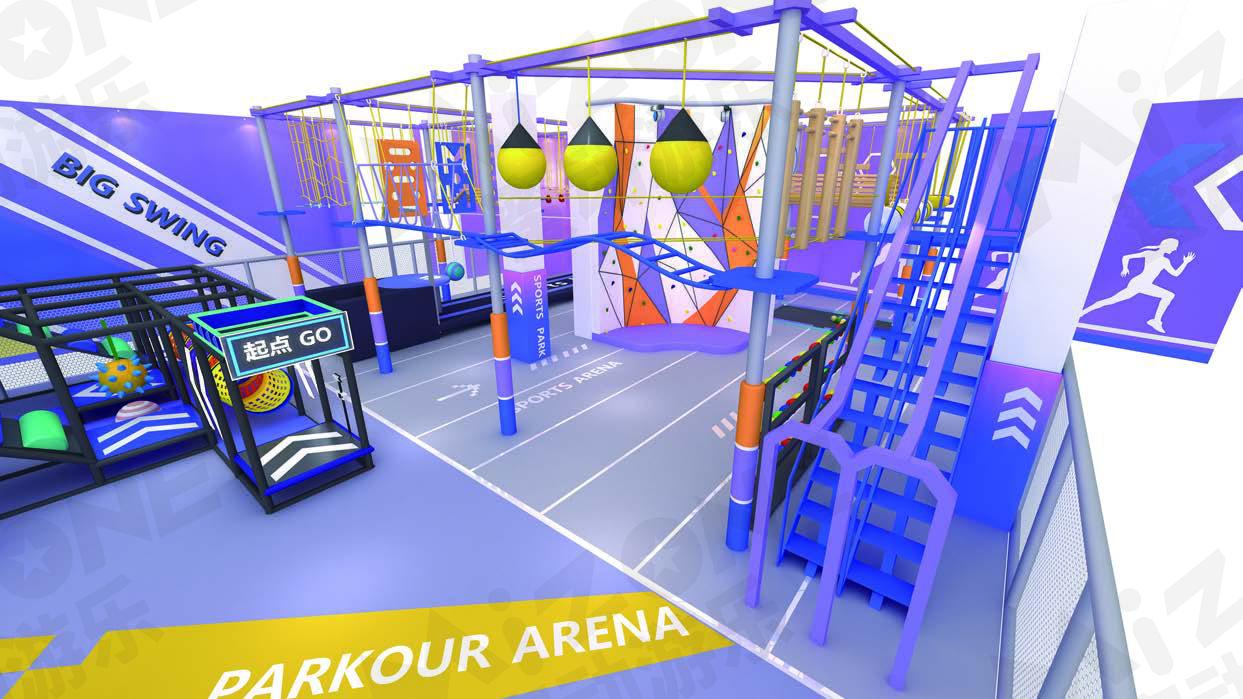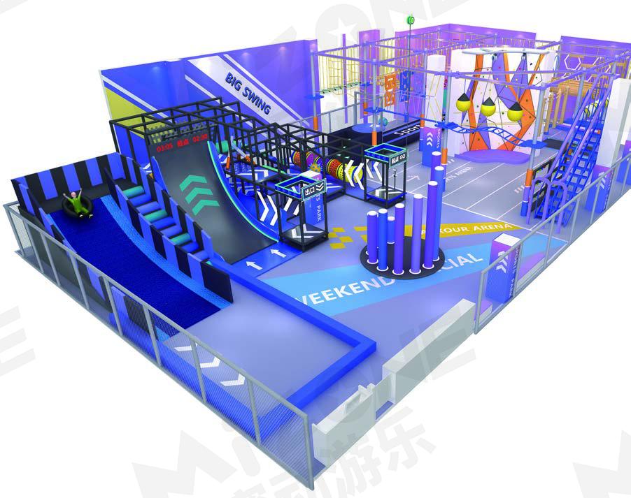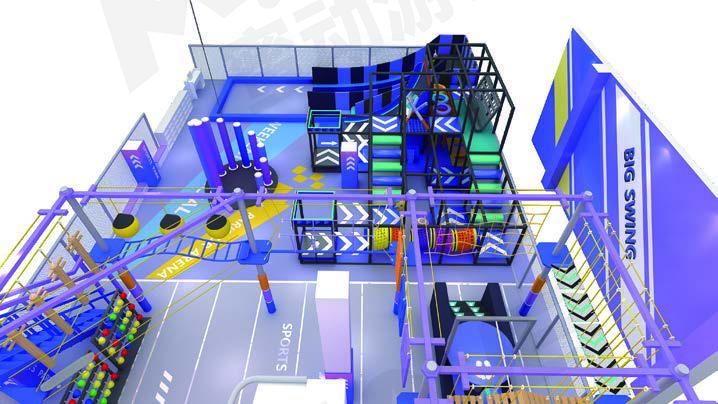 這座室內(nèi)運(yùn)動(dòng)館以紫藍(lán)交融為特色,動(dòng)感十足,宛如夢幻樂園。忍者拓展區(qū),紫底藍(lán)線,神秘又靈動(dòng);高空拓展區(qū),藍(lán)道紫韻,如云端漫步;滑草滑梯區(qū),藍(lán)河流淌,歡樂無限;抱石攀巖區(qū),紫墻藍(lán)星,力量與挑戰(zhàn);漸變梅花樁區(qū),紫藍(lán)漸變,如夢似幻??靵磉@里,感受紫藍(lán)色的魅力,盡享運(yùn)動(dòng)的樂趣!