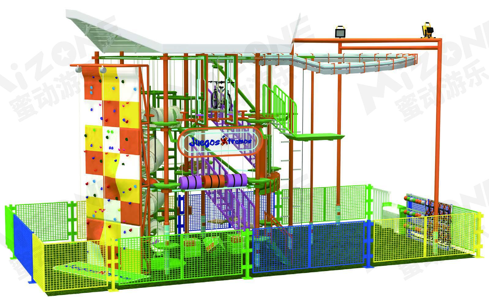 面積:100m2 | 地點(diǎn):危地馬拉 戶外拓展樂園,綠意滿滿活力四射!高空拓展上綠繩交織,挑戰(zhàn)者穿梭其中,勇探高空。黃橙色抱石攀巖,綠背景中格外醒目。在8米的高空中滑行者如乘飛馳列車歡樂無窮。