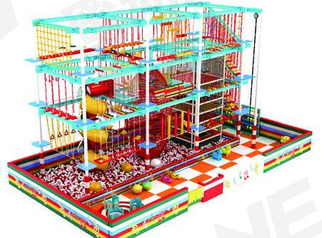 室內(nèi)中庭設(shè)計(jì)以紅色為主,藍(lán)色和黃色點(diǎn)綴。高空拓展區(qū)紅色背景激發(fā)冒險(xiǎn)精神,網(wǎng)籠區(qū)紅色網(wǎng)繩穩(wěn)固安全,滑梯與球池區(qū)黃色球池帶來歡樂。整體色彩交織,生動(dòng)立體,提供樂趣與挑戰(zhàn)。