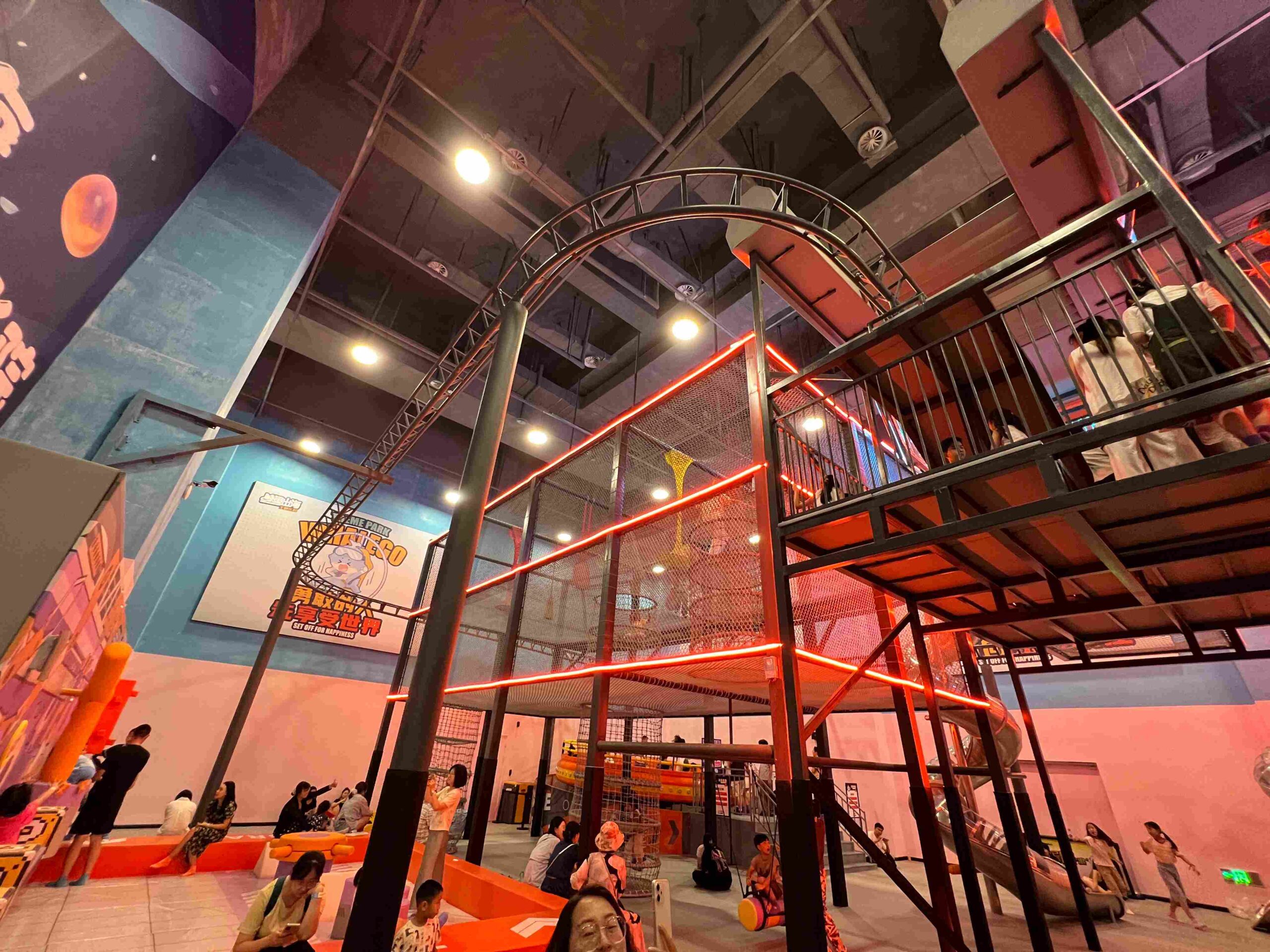 蜜動(dòng)方案:采用“垂直空間利用法”,如廣州奧體優(yōu)托邦670㎡場(chǎng)館(20米高),在高空設(shè)置拓展區(qū),中層布置滑梯矩陣,地面規(guī)劃蹦床區(qū),空間利用率提升至90%。