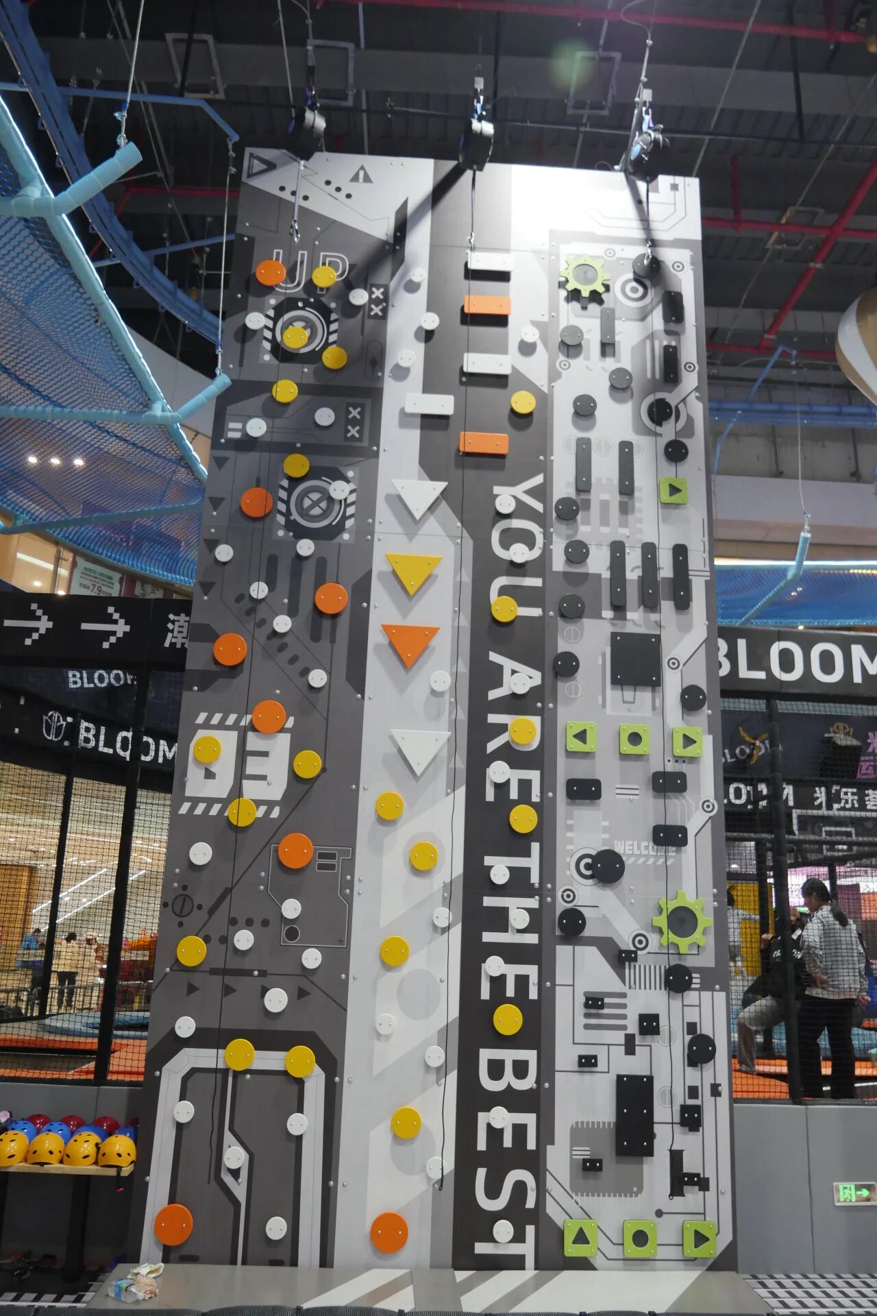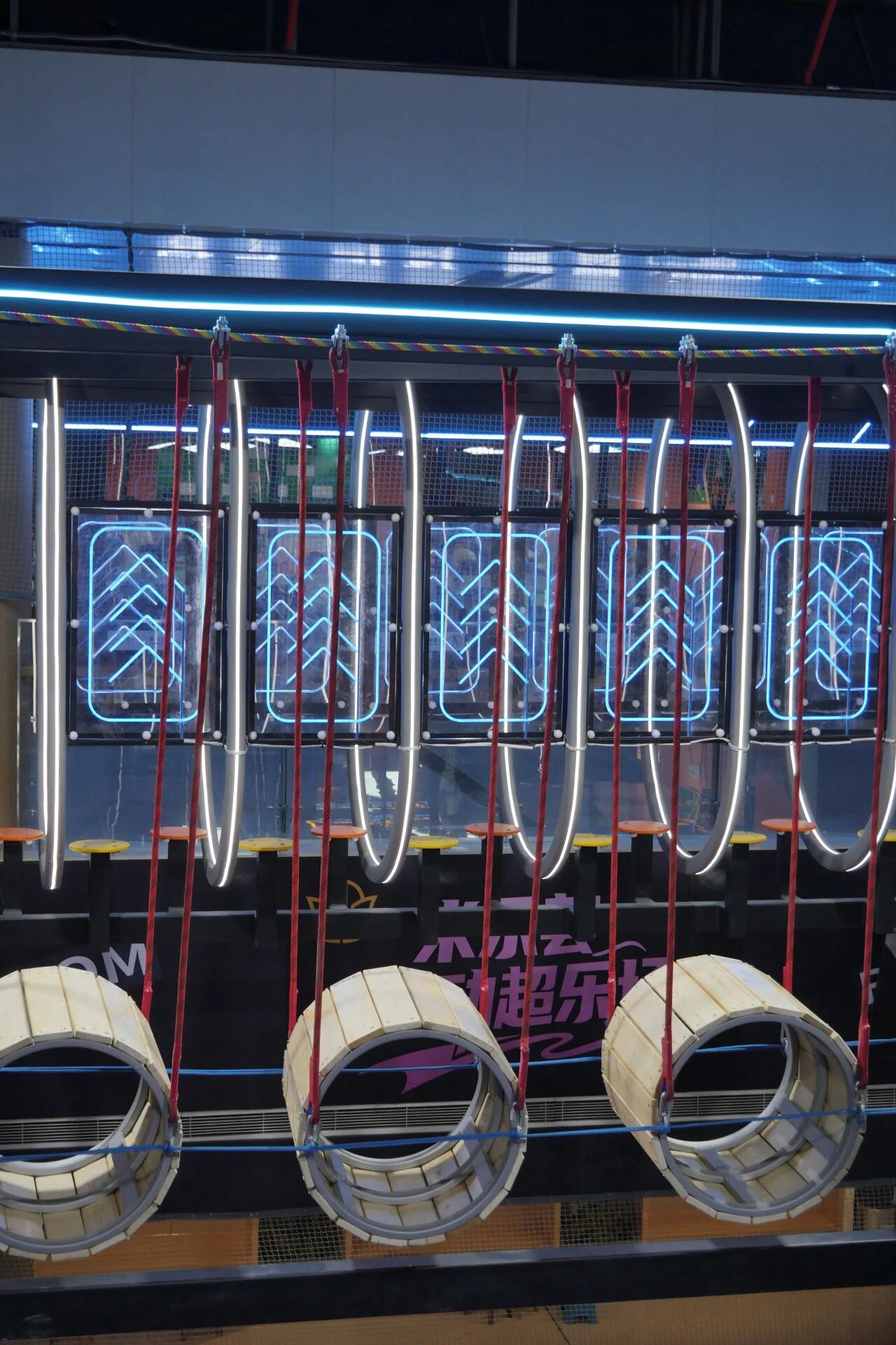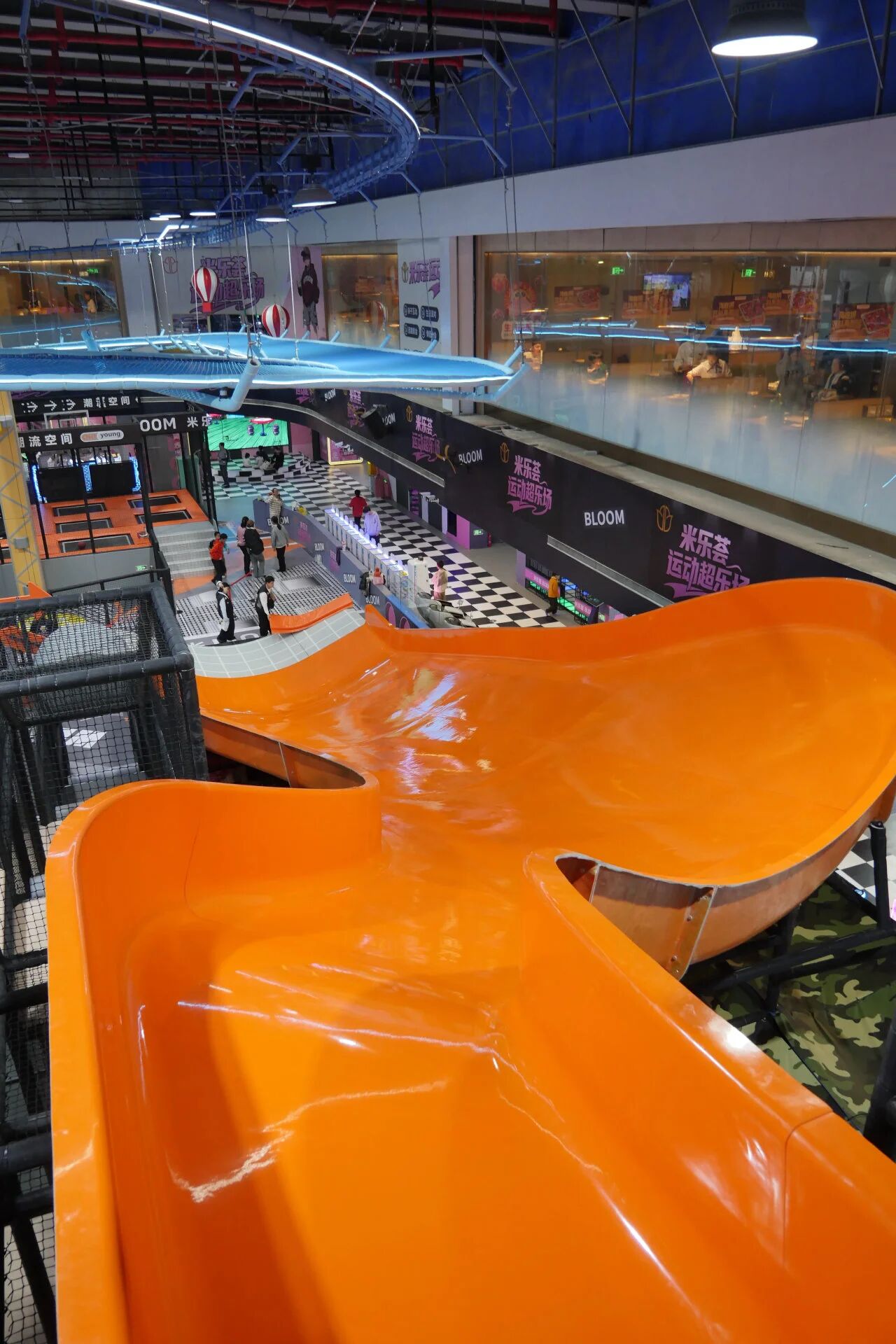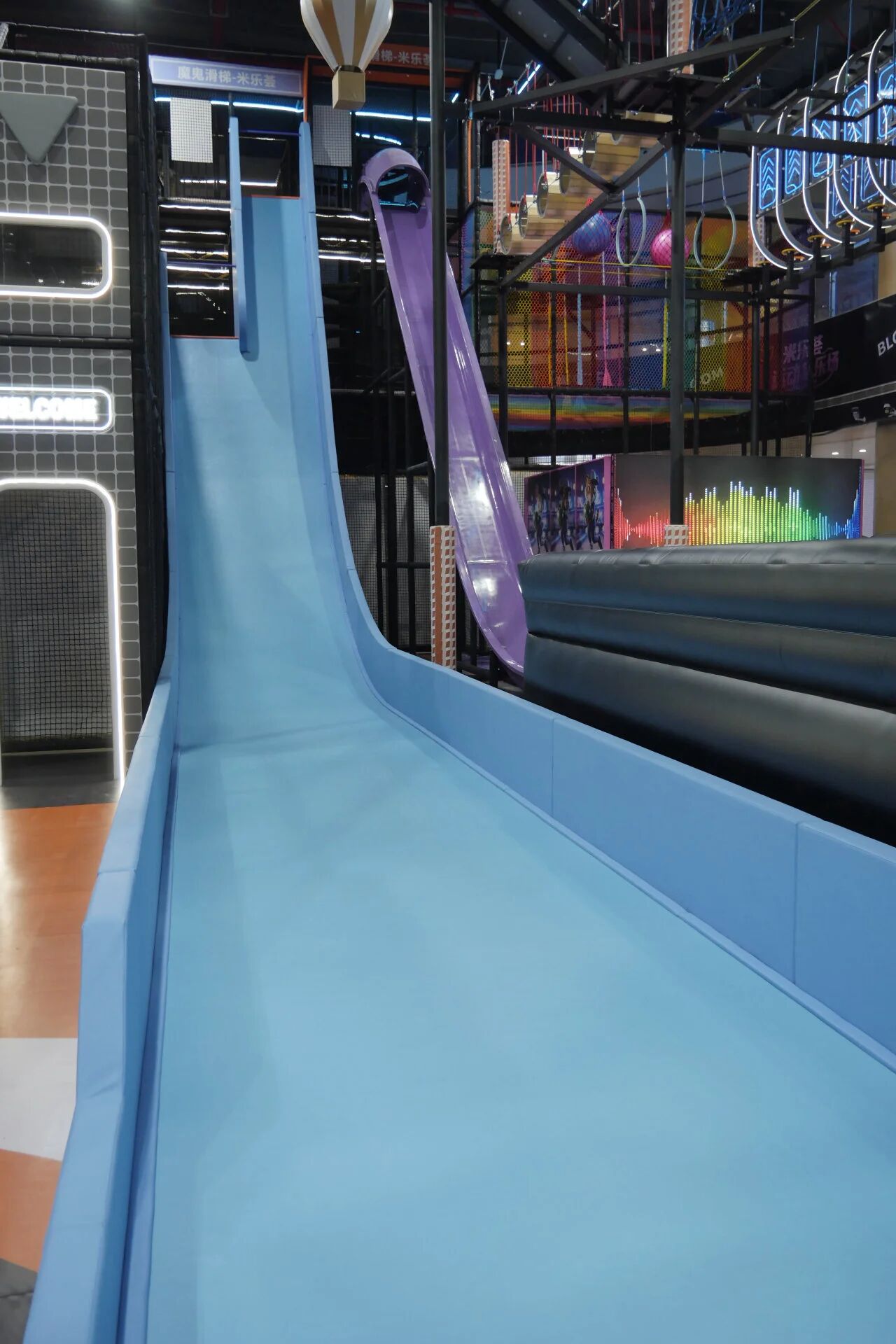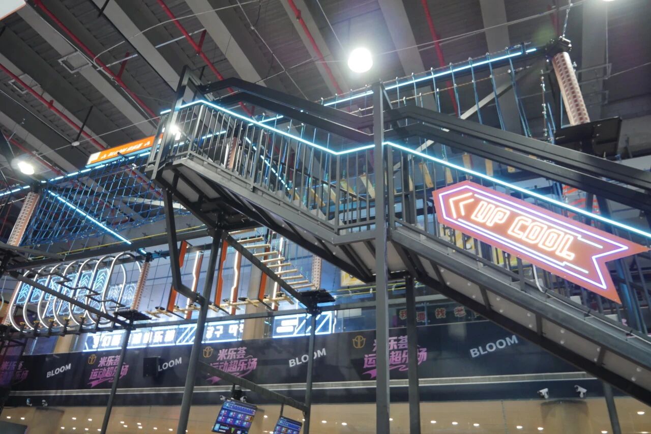 場地不大,功能不能少。設(shè)計團(tuán)隊(duì)將813㎡切分為六大模塊: 滑梯矩陣區(qū)——多條滑道并置,制造視覺沖擊,也分流排隊(duì)壓力; 攀巖區(qū)——垂直空間的利用,滿足挑戰(zhàn)型用戶; 拓展區(qū)——高空探險元素,拉長體驗(yàn)時間;蹦床區(qū)——經(jīng)典引流項(xiàng)目,覆蓋全年齡段; CS區(qū)——對戰(zhàn)場景,激活社交屬性; 舞臺區(qū)——預(yù)留活動空間,承接生日派對、團(tuán)建等高客單場景。